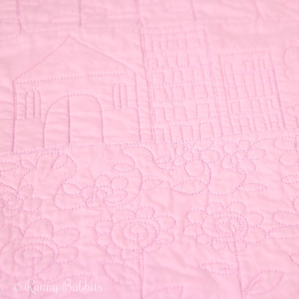 It features quilt patterns of family scenes, tree-lined avenues with cars and traffic lights, street scenes and rows of heart-shaped flowers quilted in pink thread on a pink ground to subtle effect, and has a delicate white-on-pink print on the reverse. The quilt is edge bound in a plain silver-grey cotton with a pretty rose print.