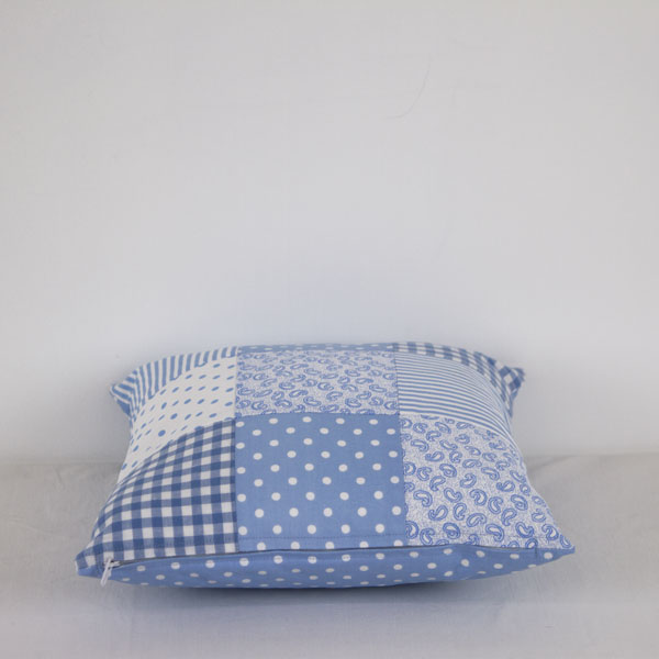 A simple blue and white patchwork cushion with a polka dot reverse. The zip is at the bottom.